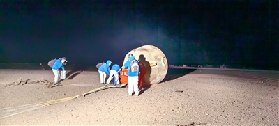 随着“砰”的一声巨响,耀眼的橘黄色火焰从飞船返回舱底部喷薄而出,缓冲发动机点火成功,返回舱稳稳降落在戈壁滩上。轰隆隆的螺旋桨声、地面飞驰的车队声、对讲机中的调度声,一时间汇成了迎接英雄回家的交响曲。