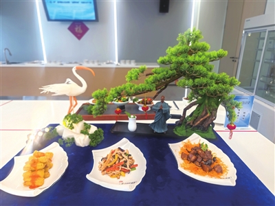 根据规则,在80分钟时间内,校厨们需要烹饪3道菜品,自选菜为1道荤菜和1道素菜,是各校推选出的深受学生喜爱的菜品,指定菜“香干肉丝”则考验校厨们的基本功底。现场,校厨们各显身手,蒸、炒、煮、炖、煎、炸齐上阵,色香味俱全的菜肴让人垂涎欲滴。