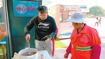 王水发是环卫岗位上的老员工,他说,这样的送温暖活动是这里的“家常便饭”。“天冷喝一点热的东西,整个人都感觉很舒服,很暖胃。我们经常能感受到大家对我们的关心,工作的时候心情好,干劲也足!”王水发乐呵呵地说。