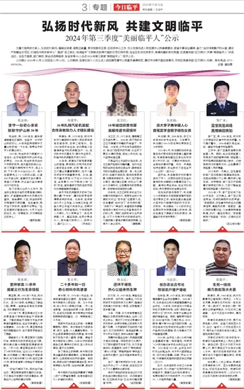 为着力培养时代新人、弘扬时代新风,唱响主旋律、凝聚正能量,更好地服务区委、区政府中心工作,充分发挥先进人物在提升公民道德建设、振奋干事创业精神、奋力“当好深度融沪桥头堡、建设产城融合示范区、打造杭州城东新中心”、推进“浙江有礼·和润临平”文明新实践等方面的示范引领作用,在全区形成见贤思齐、崇德向善的良好氛围,区委宣传部(区文明办)开展“美丽临平人”评选活动。经各方推荐、部门审核、联合评选等程序,张金林等10人获评2024年第三季度“美丽临平人”,现予公示。