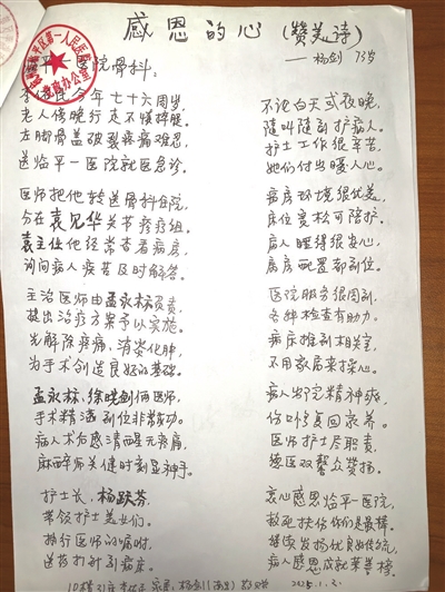 每次来院,护士们总会叮嘱“阿姨路上当心”。对行动不便的刘大伯,他们更是经常主动询问是否需要帮助;查房时细心备好温水,术后手把手指导拐杖使用;护工默契配合协助翻身、调整床位……这些温暖的细节,都被杨阿姨默默记在心里。此刻,这首真挚的小诗,便是她最特别的感谢。
